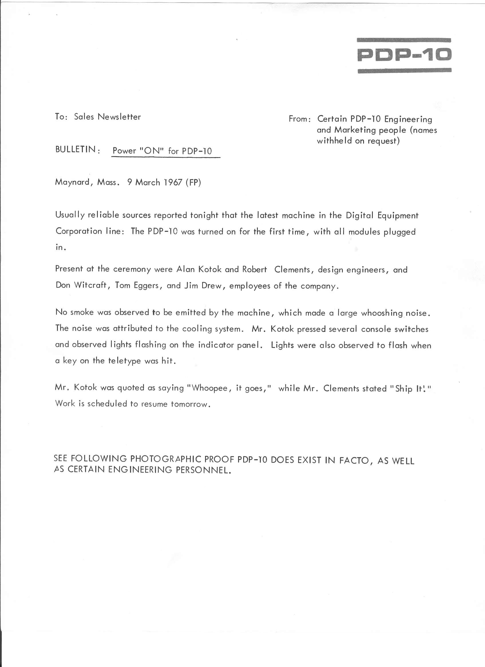 From: "Bob, K1BC"Subject: Re: pdp10 photos on ebay Newsgroups: alt.sys.pdp10 Date: Sun, 04 Jan 2009 21:08:07 -0500 I found copies of those in my "archive" and have scanned them, and a few other things. I'm not thrilled with the quality of the scanned images, but it's too late to fool with them any more tonight. Also too late to write up any further commentary. They're up at http://www.gzornenplatz.com/DECPIX/. This is on my home DSL line, so if anyone wants to copy them to a higher-bandwidth site, please do. /Rcc